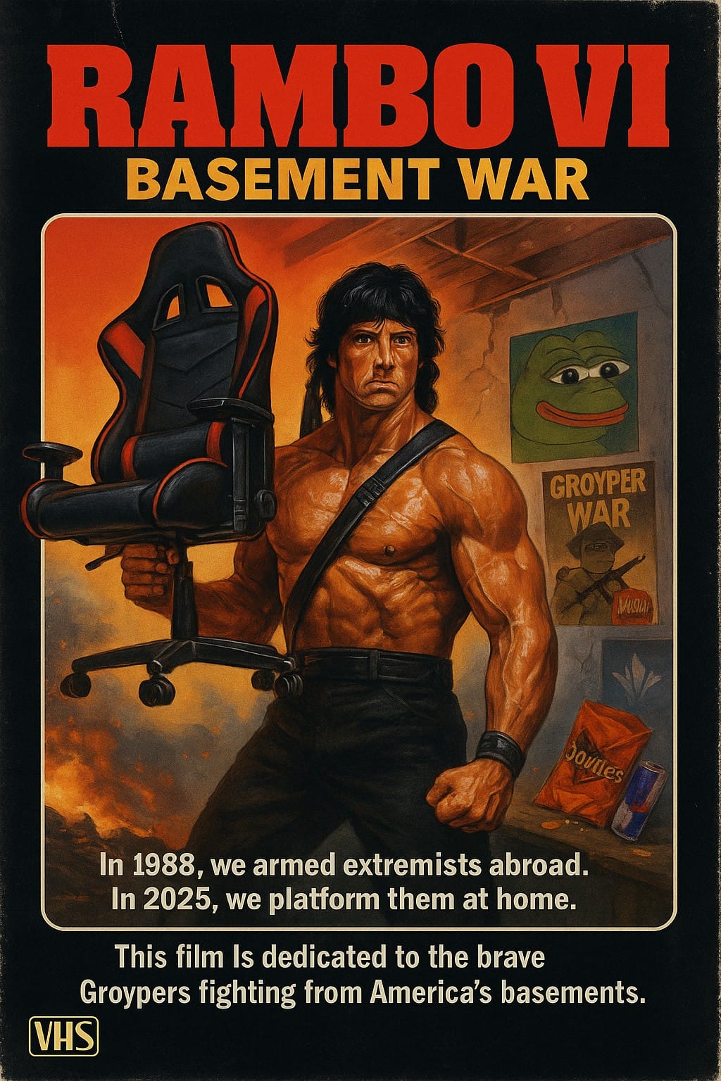 The Groypers are the new Mujahideen. Minus the Kalashnikovs, plus bone-softening vitamin D deficiency.